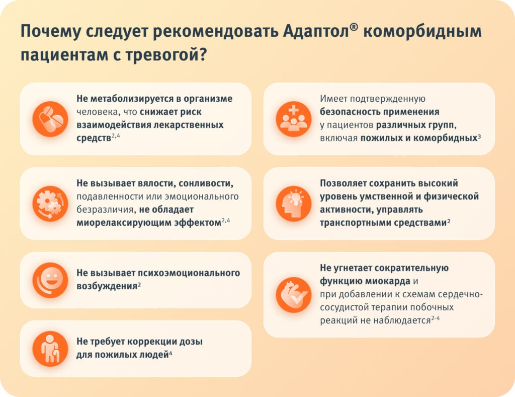 Препаратом выбора в данном случае может стать Адаптол® — анксиолитик с доказанной эффективностью и хорошей переносимостью у пациентов с коморбидной патологией1-3.
