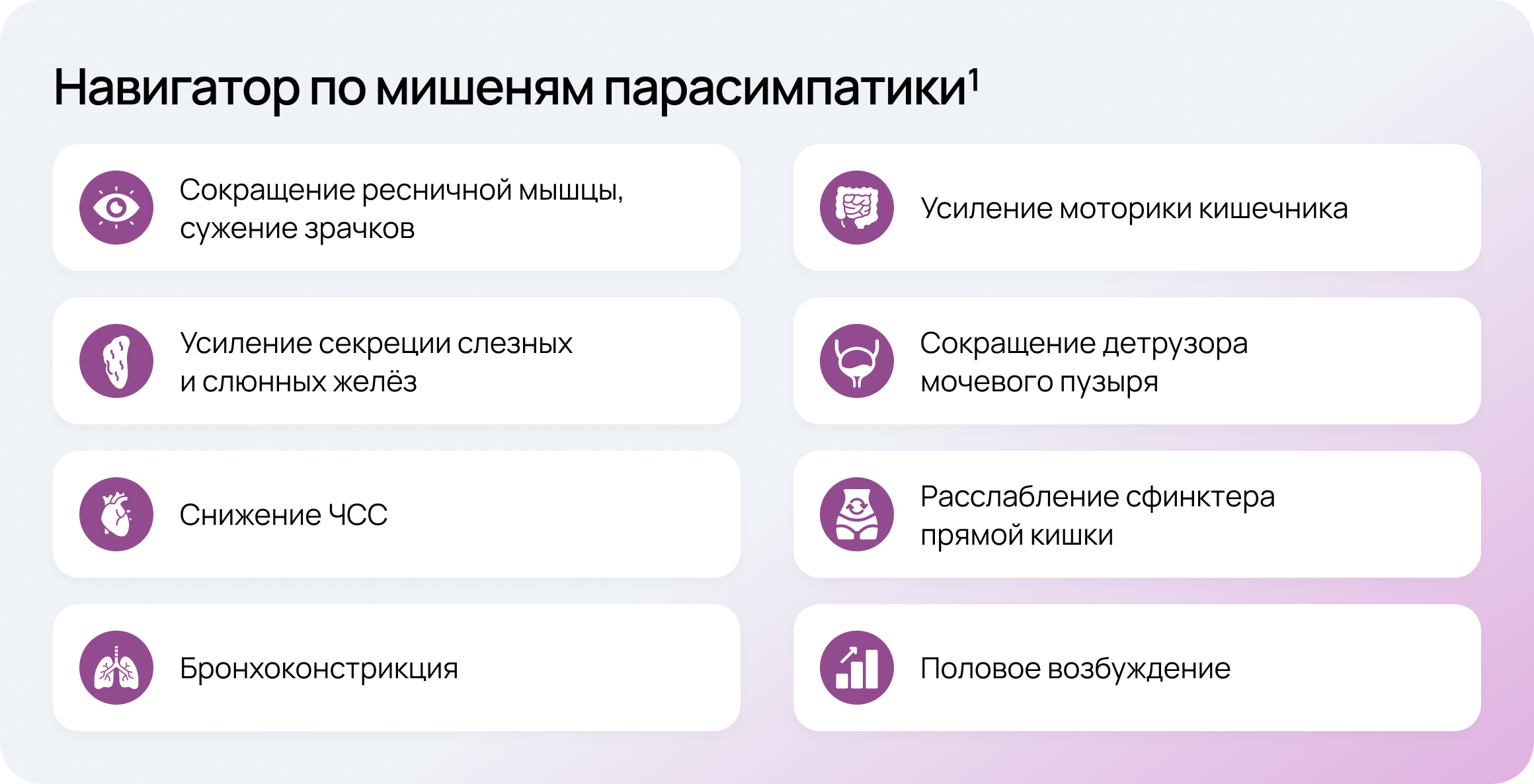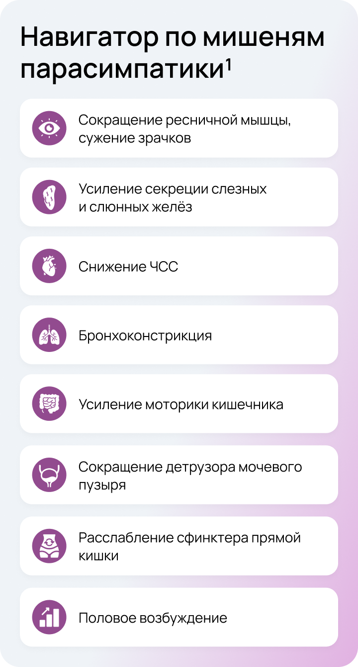 основной нейротрансмиттер парасимпатической системы. Сигнал проходит через никотиновые рецепторы ганглиев, а затем через мускариновые рецепторы периферических органов, регулируя выраженность автономных функций