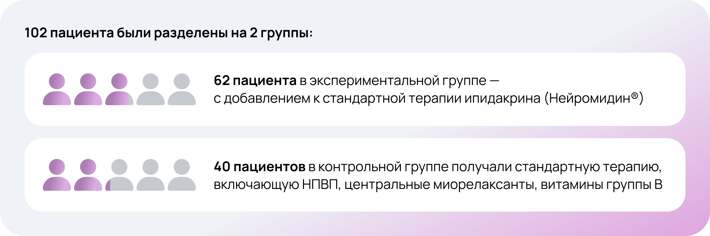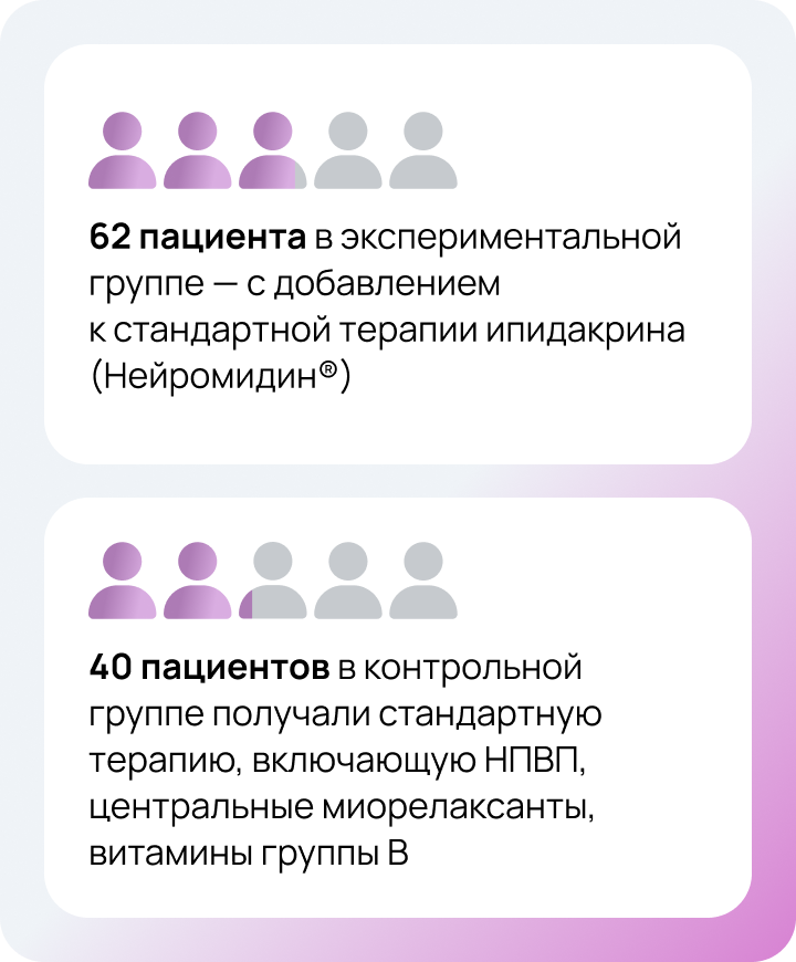Режим и дозы терапии подбирались согласно действующей инструкции по медицинскому применению. Эффективность и безопасность терапии в экспериментальной группе определялась как с помощью клинической оценки и опросников, так и нейрофизиологического контроля на электронейромиографии.