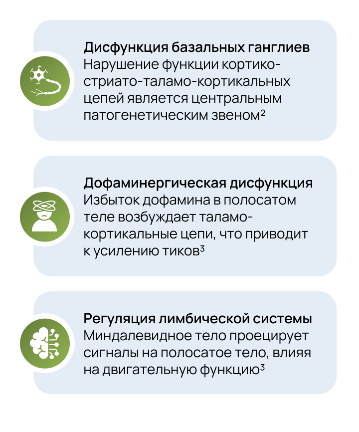 Прежде всего необходимо определить основные звенья патогенеза и вовлеченные в процесс формирования тиков структуры мозга:
